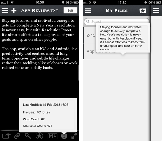 By default, all your messages are saved to Dropbox and, whenever you want to start a new note, you simply hit the plus symbol at the top of the screen and your current message will be saved automatically. If you need to quickly return to it, a swipe right reveals a list of all your synchronized notes, and you can also long-press any message to view a preview of its contents, which is particularly useful.”