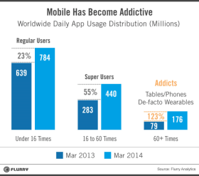 These numbers are amazing. “The number of people who launch apps more than 60 times per day on phones or tablets doubled in the past year.” From Time magazine.