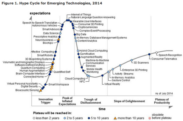 Terrific graphic from Geekwire. Looks like we are at the peak of the Internet of Things – as we are waiting for the iWatch (??) “The Hype Cycle for Emerging Technologies is the broadest aggregate Gartner Hype Cycle, featuring technologies that are the focus of attention because of particularly high levels of hype, or those that Gartner believes have the potential for significant impact,”